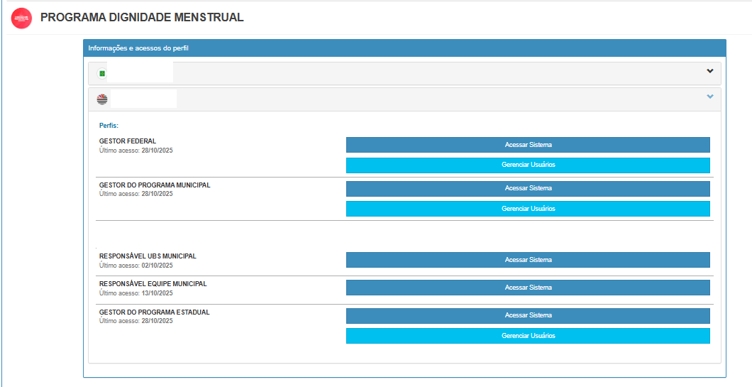 Atualmente, é possível acessar o sistema utilizando um dos seguintes perfis: Gestor Federal, Municipal, Estadual, Responsável Equipe Municipal e Responsável UBS Municipal. O tipo de perfil determina os níveis de visualização e operação disponíveis.