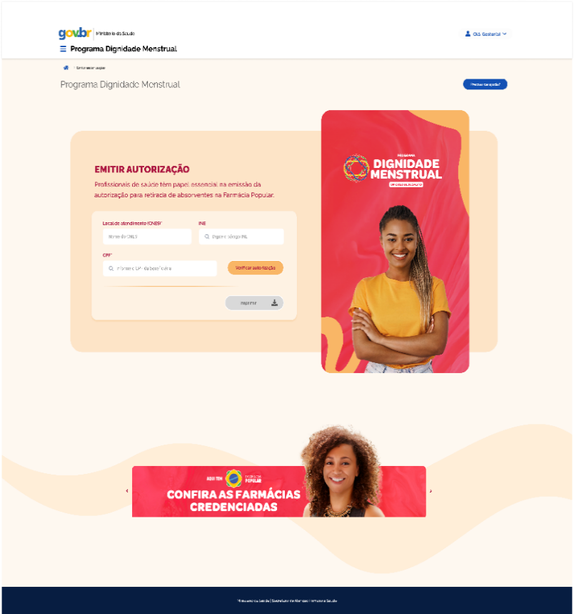 O acesso ao Programa Dignidade Menstrual é realizado por meio da plataforma e-gestor APS ou diretamente no endereço eletrônico do PDM: https://sisaps.saude.gov.br/sistemas/dignidademenstrual/.