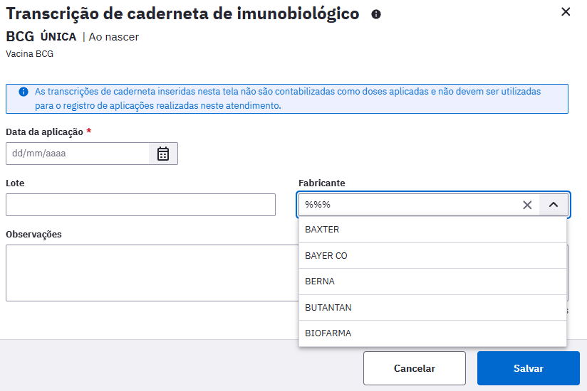 - Validação para que registros de transcrição de caderneta no Prontuário Eletrônico seja feitos apenas com fabricantes padronizados, impedindo o registro manual (alinhado com RIA 2.0).