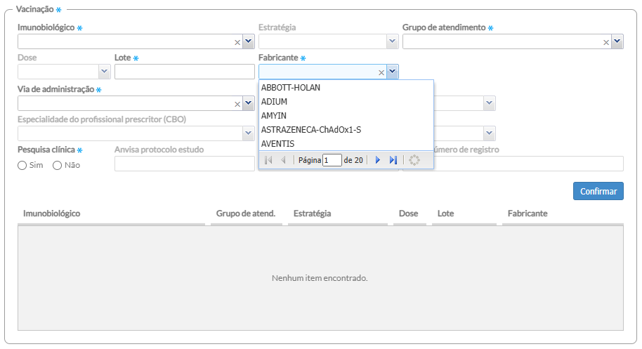 - Implementada no módulo CDS a validação para que os registros de aplicações de imunobiológicos sejam feitos apenas com fabricantes padronizados, impedindo o registro manual, acompanhando o fluxo existente nos registros do Prontuário Eletrônico (alinhado com RIA 2.0);