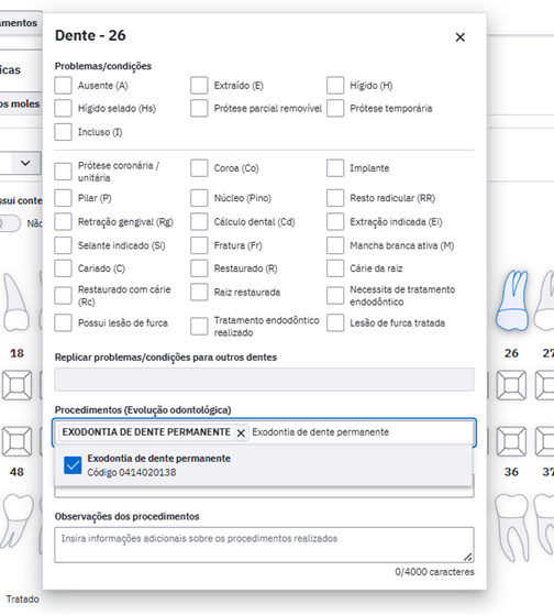 O registro de exodontia é feito no Plano do SOAP, em Evoluções Odontológicas, aba Odontograma, conforme figura 3. Para este indicador serão consideradas as exodontias de dentes permanentes, com alveoloplastia ou não. O cirurgião-seleciona o nº do dente que fará o procedimento, e na janela aberta, registra o procedimento O Prontuário Eletrônico abrirá uma janela para registro das intervenções naquele dente. Nesta janela, no campo "Procedimentos (Evolução odontológica)" deve ser registrado o Sigtap 04.14.02.013-8 - EXODONTIA DE DENTE PERMANENTE.