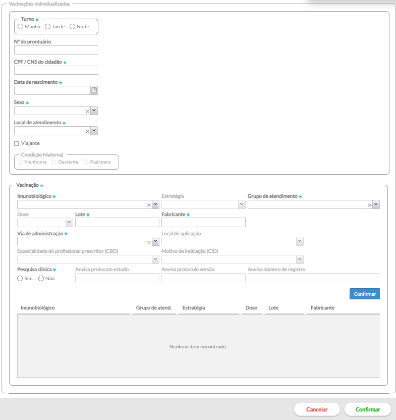 digite os dados conforme preenchido na ficha, iniciando pelo Turno da administração do imunobiológico, os dados de identificação do cidadão, o local de atendimento e o grupo, se for o caso: