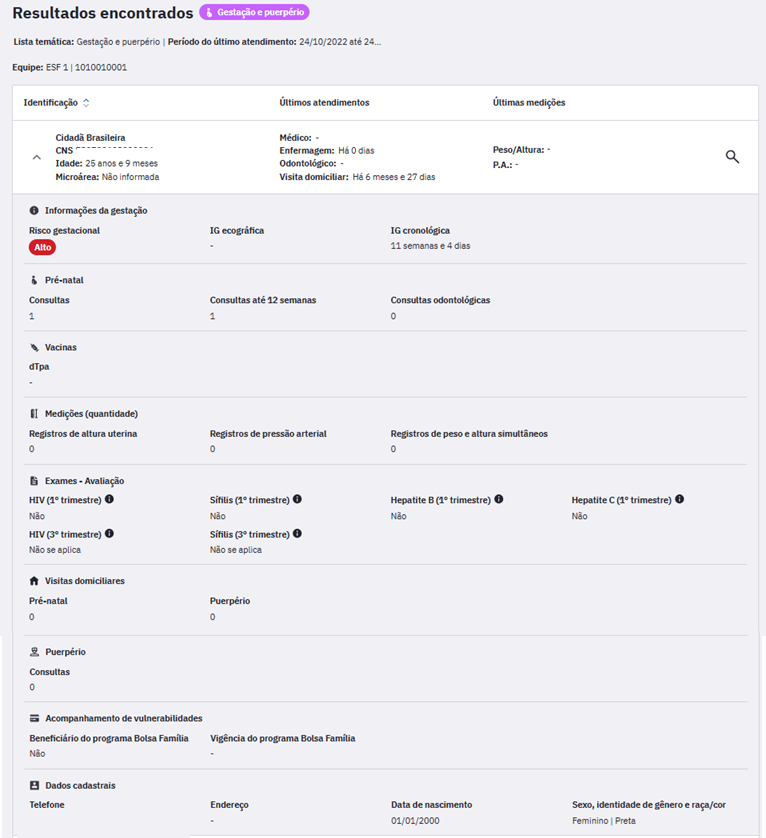 As diversas listas temáticas, empregadas como ferramenta de pesquisa no sistema, exibirão informações detalhadas e específicas, correlacionadas a cada filtro aplicado. Tais informações incluem: dados de últimas consultas, medições (clínicas ou antropométricas), visitas domiciliares, status de acompanhamento de vulnerabilidades (como a condição de beneficiário(a) do Programa Bolsa Família), dados cadastrais atualizados, além de outros detalhes informativos exclusivos de cada lista temática consultada.