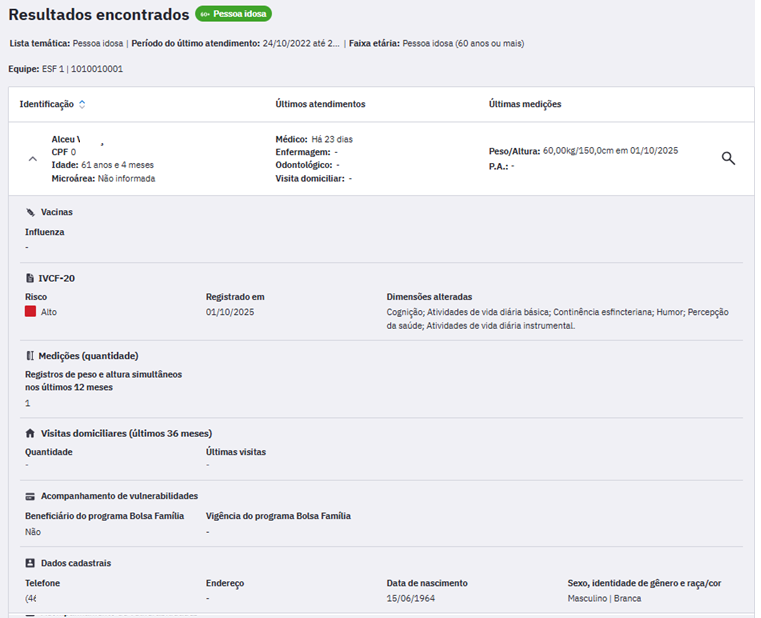 Pessoa Idosa: Nesta listagem estão todas as pessoas acima de 60 anos de idade, sendo possível a visualização de medições, visitas domiciliares. Também foi incluso, o filtro IVCF-20 utilizado para identificar pessoas idosas em risco, considerando aspectos multidimensionais da sua saúde, sendo possível filtrar por pontuação ou índice.
