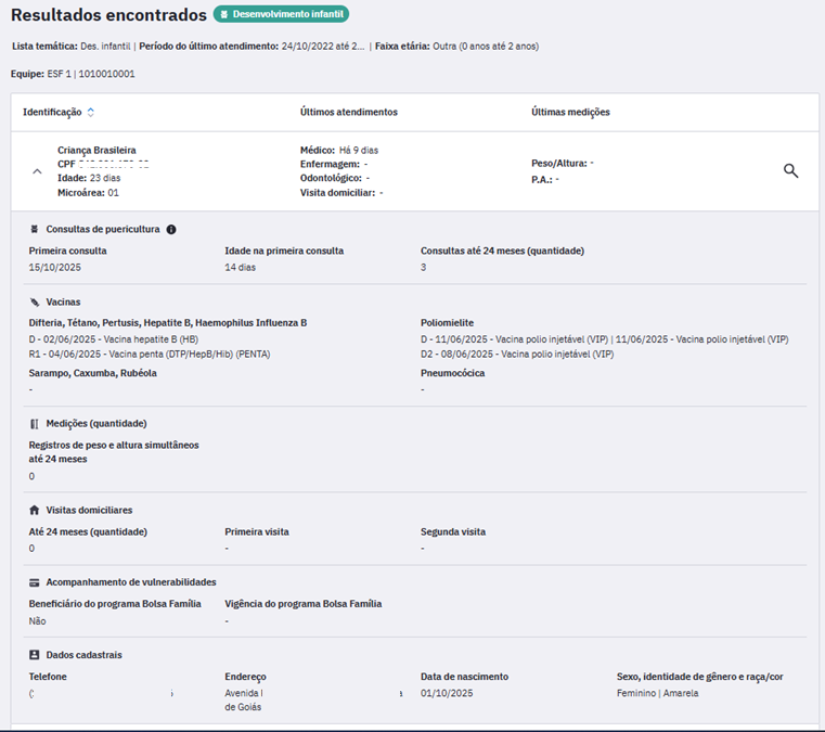 Desenvolvimento Infantil: neste filtro você poderá consultar todas as pessoas de 0 a 19 anos de idade, as medições, visitas domiciliares e consultas realizadas.