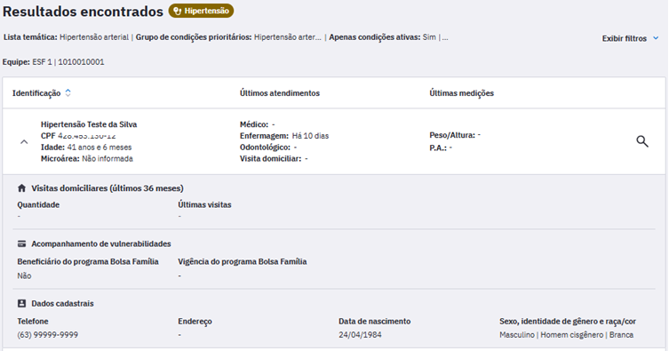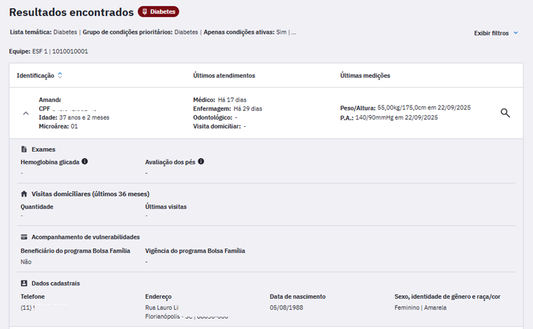 Ao visualizar a lista dos cidadãos encontrados, é possível identificar os filtros utilizados, tendo como objetivo facilitar a visualização da busca realizada, permitindo que o profissional identifique rapidamente quais critérios foram utilizados na filtragem dos dados apresentados. A inclusão dessa funcionalidade aprimora a usabilidade e a transparência na navegação das listas temáticas, contribuindo para uma experiência mais intuitiva e eficiente no acompanhamento das informações de saúde.