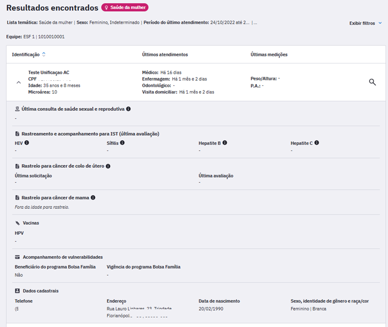Saúde da mulher: é possível visualizar todas as pessoas do sexo feminino, bem como últimos atendimentos, últimas medições, última consulta de saúde sexual e reprodutiva, rastreamento e acompanhamento para IST (última avaliação), testes rápidos HIV, sífilis, hepatite B, hepatite C, rastreio para câncer de colo de útero e mama e dados cadastrais.