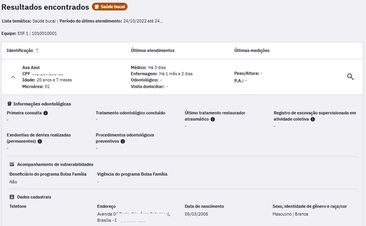 Os cidadãos encontrados serão sinalizados com nome, CPF, endereço, telefone e data do último atendimento. É possível exportar os dados encontrados em CSV bem como imprimi-lo.