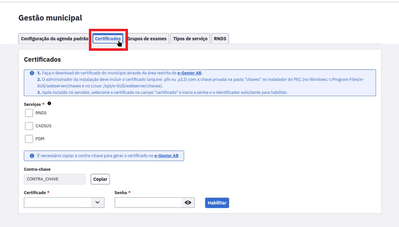 Possuir o certificado digital do e-Gestor APS habilitado na instalação, o mesmo utilizado para conexão com o CadSUS e a RNDS (Manual);