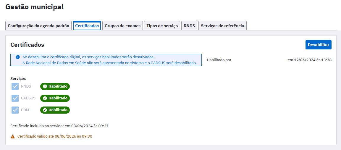Na sequencia a função será exibida como “Habilitada” e o sistema exibirá a mensagem “Certificado habilitado com sucesso”.