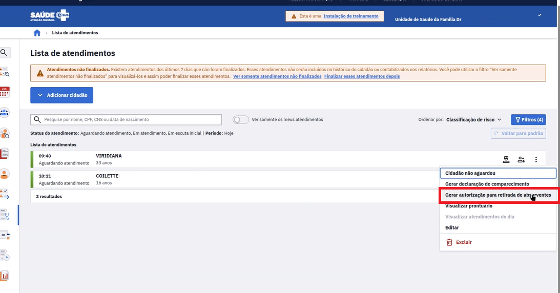 O profissional de saúde deve realizar o acesso com sua credencial gov.br e, na lista de atendimentos, após adicionar o cidadão, clicar nos três pontos localizados na lateral direita (conforme ilustrado na imagem) e selecionar a opção “Gerar autorização para a retirada de absorventes” para emitir o documento.