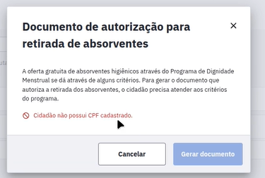 "A oferta gratuita de absorventes higiênicos atraves do Programa Dignidade Menstrual se dá através de alguns critérios. Para gerar o documento que autoriza a retirada dos absorventes, o cidadão precisa atender aos critérios do programa".