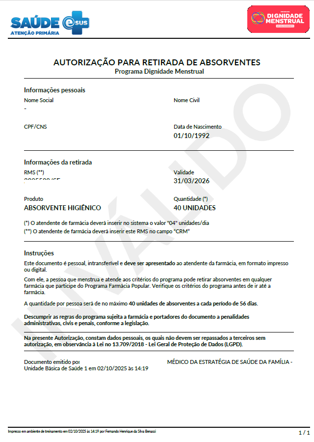 Neste contexto, foi criada uma nova funcionalidade no sistema, destinada a assegurar o direito à dignidade menstrual, permitindo gerar autorização para retirada de absorventes do Programa Dignidade Menstrual (PDM), conforme Lei n.º 14.214/2021, Decreto n.º 11.432/2023 e Portaria GM/MS n.º 3.076/2024, que regulamentam a disponibilização gratuita dos absorventes para pessoas que menstruam e se enquadram nos critérios do programa.