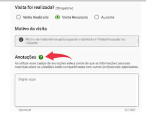 A partir da versão 4.3.0 a funcionalidade de campo de anotações no cadastro de visitas. Este espaço é reservado para informações que o TACS e ACS considerem relevantes, por exemplo: problemas reportados pelos cidadãos, tratamentos e/ou qualquer acompanhamento que considerar necessário. Essas anotações poderão ser consultadas no histórico das visitas.