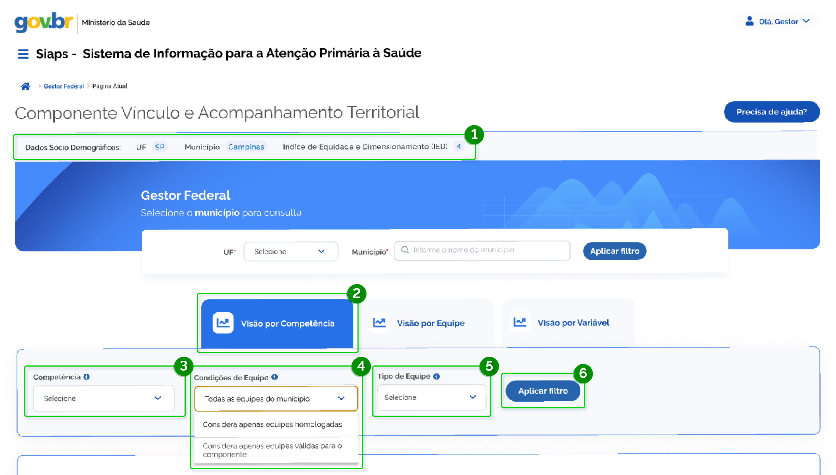 Para acompanhamento desse componente, o Siaps disponibiliza as visualizações por Competência, visão por equipe e visão por indicador. Abaixo o detalhamento da tela desse componente (Figura 6.1).