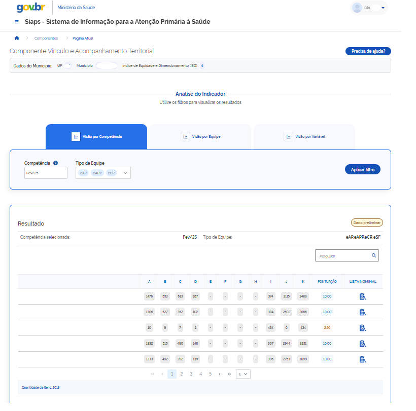 Para consultar o detalhamento da Lista Nominal dos indicadores, acesse a visão por competência no Siaps. Em seguida, clique no respectivo ícone da Lista Nominal para visualizar as informações detalhadas.