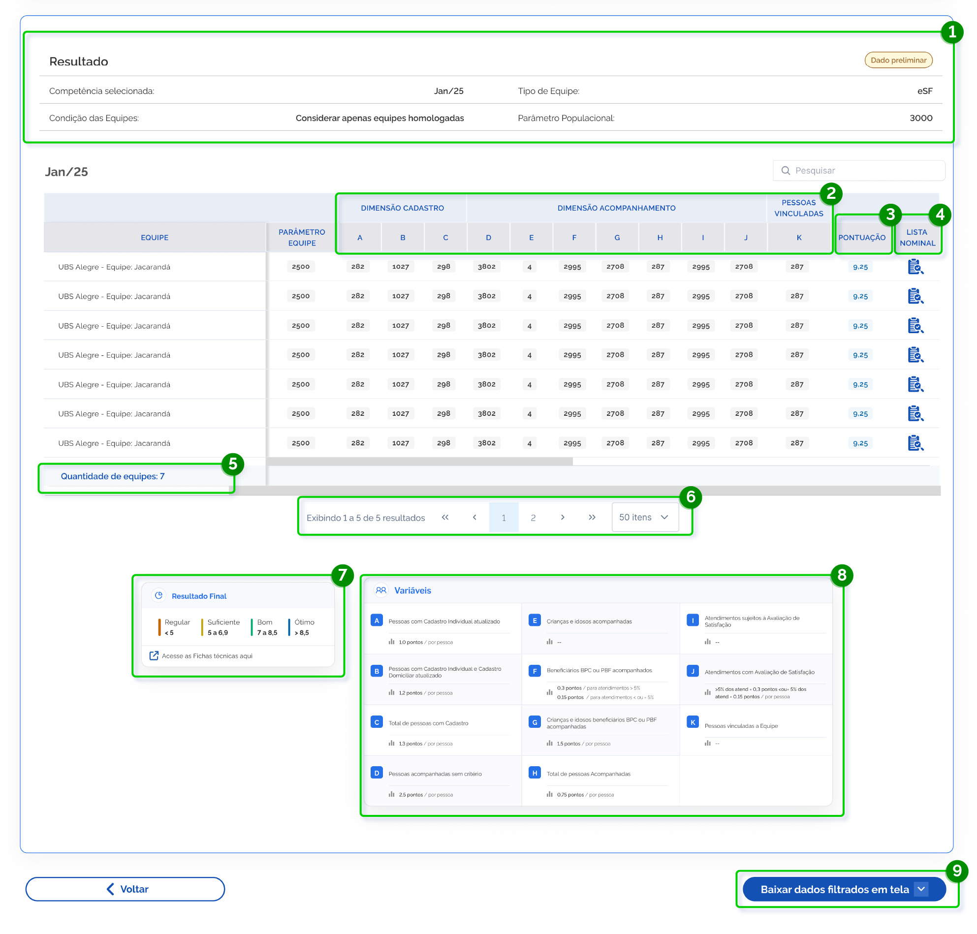 1. Resumo do filtro: apresenta o nome da variável, competência e tipo de equipe aplicados no filtro.