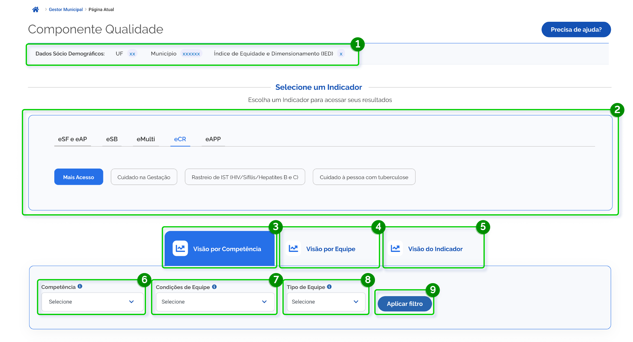 1. Resumo do filtro: apresenta o indicador, a competência e o tipo de equipe selecionada