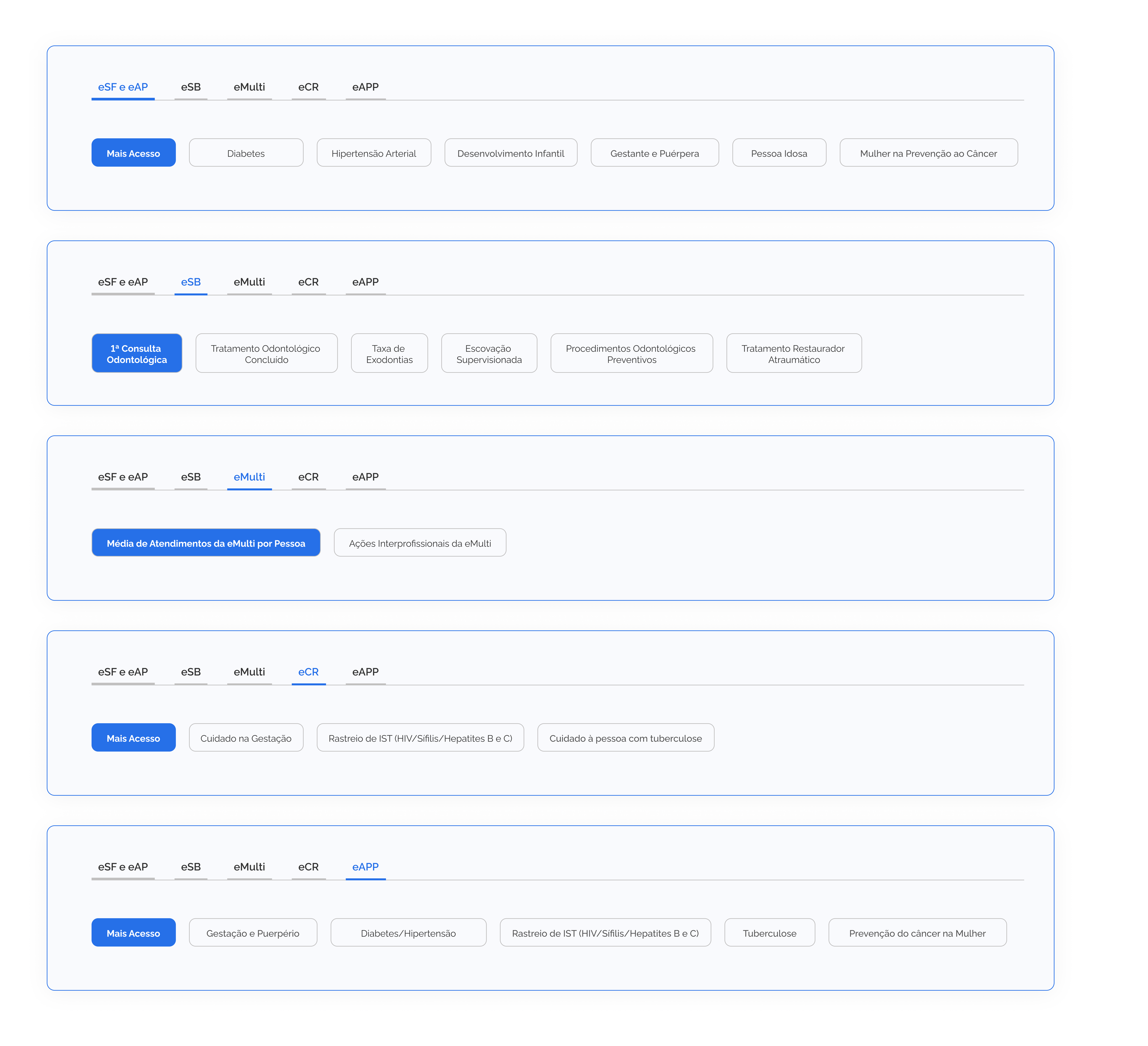 Inicialmente, é necessário selecionar quais indicadores deseja acessar, sendo possível escolher entre os indicadores das equipes de Saúde da Família (eSF) e Atenção Primária (eAP), equipes de Saúde Bucal (eSB), equipes Multiprofissionais (eMulti), da equipe Consultório na Rua (eCR) e da equipe de Atenção Primária Prisional (eAPP). Após essa seleção, o sistema direcionará para a tela de visualização dos dados. Nessa tela, é possível navegar entre os diferentes eixos temáticos dos indicadores, conforme a figura 6.