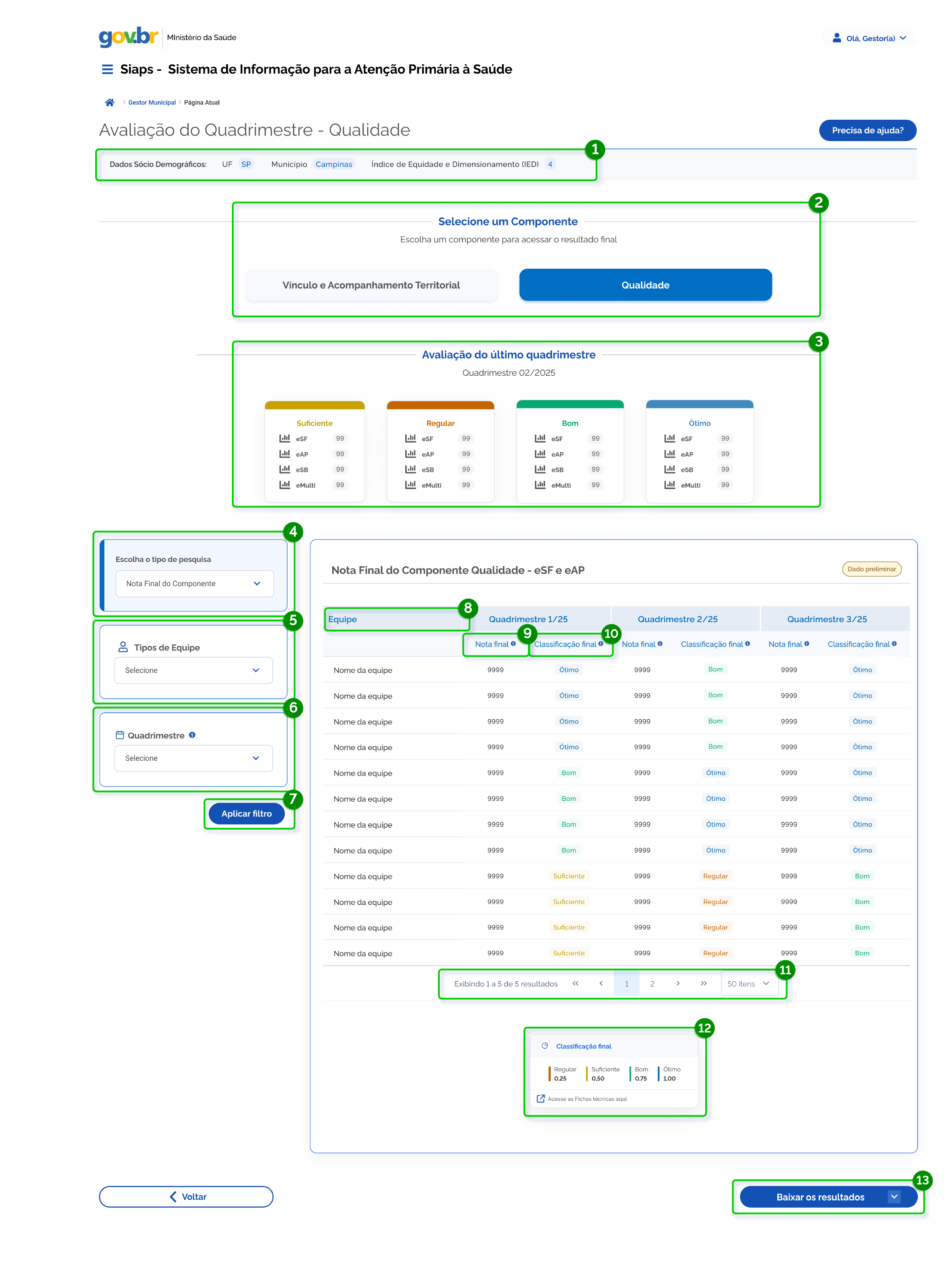 2. Avaliação do Quadrimestre: os resultados quadrimestrais são calculados a partir da média dos resultados mensais das equipes, sendo utilizados para fins de avaliação dos Componentes II e III. O sistema apresenta o cálculo quadrimestral dos componentes Vínculo e Acompanhamento Territorial e Qualidade, os quais subsidiam o cofinanciamento federal da APS no âmbito do SUS.