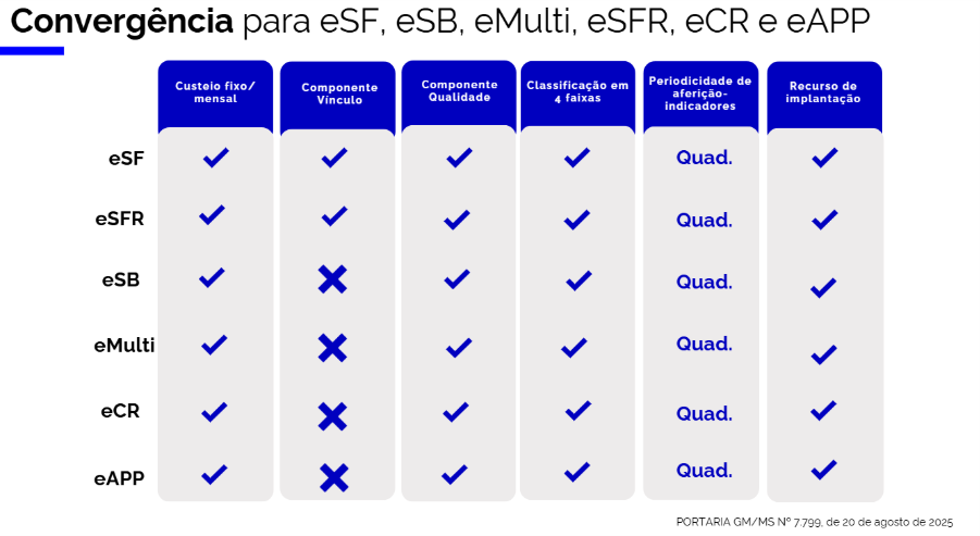 Ressalva-se ainda que, para esta convergência de modelos, a Portaria GM/MS nº 3.493/2024 revogou os indicadores e os dispositivos das portarias específicas da eMulti (Portaria GM/MS nº 635, de 22 de maio de 2023) e da eSB (Portaria GM/MS nº 960, de 17 de julho de 2023).
