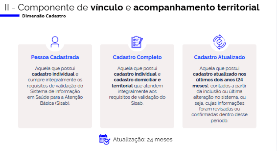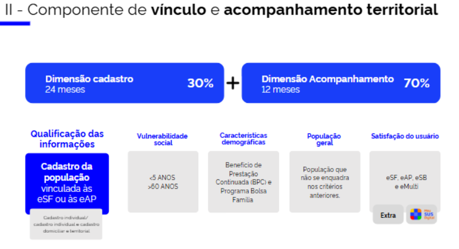 O componente de vínculo e acompanhamento territorial está estruturado em duas dimensões: a Dimensão Cadastro, que corresponde a 30%, e a Dimensão Acompanhamento, que corresponde a 70% do resultado.
