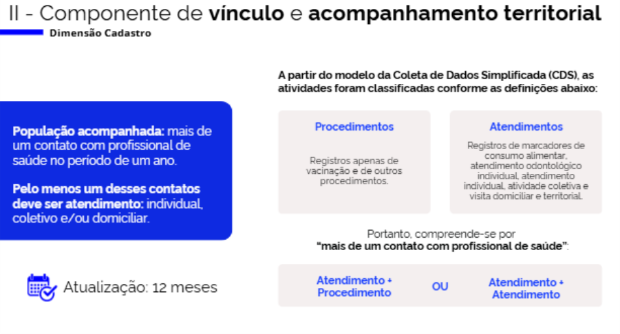O Componente de Vínculo e Acompanhamento Territorial visa estimular o aprimoramento do processo de territorialização, de análise epidemiológica e demográfica e das condições de vida da população adscrita à equipe, por intermédio da qualificação do cadastro e do acompanhamento das pessoas e famílias, priorizando populações mais vulneráveis como crianças, idosos e beneficiários de programas sociais.