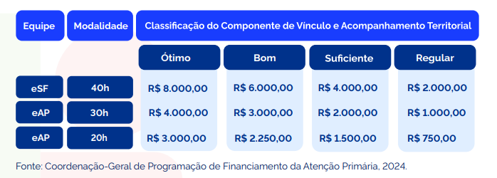 Para o componente de vínculo e acompanhamento territorial, o valor transferido mensalmente por eSF e eAP para todos os municípios será correspondente à classificação “bom” para cada tipo de equipe conforme Anexo XCIX-A à Portaria de Consolidação GM/MS nº 6, de 2017; e